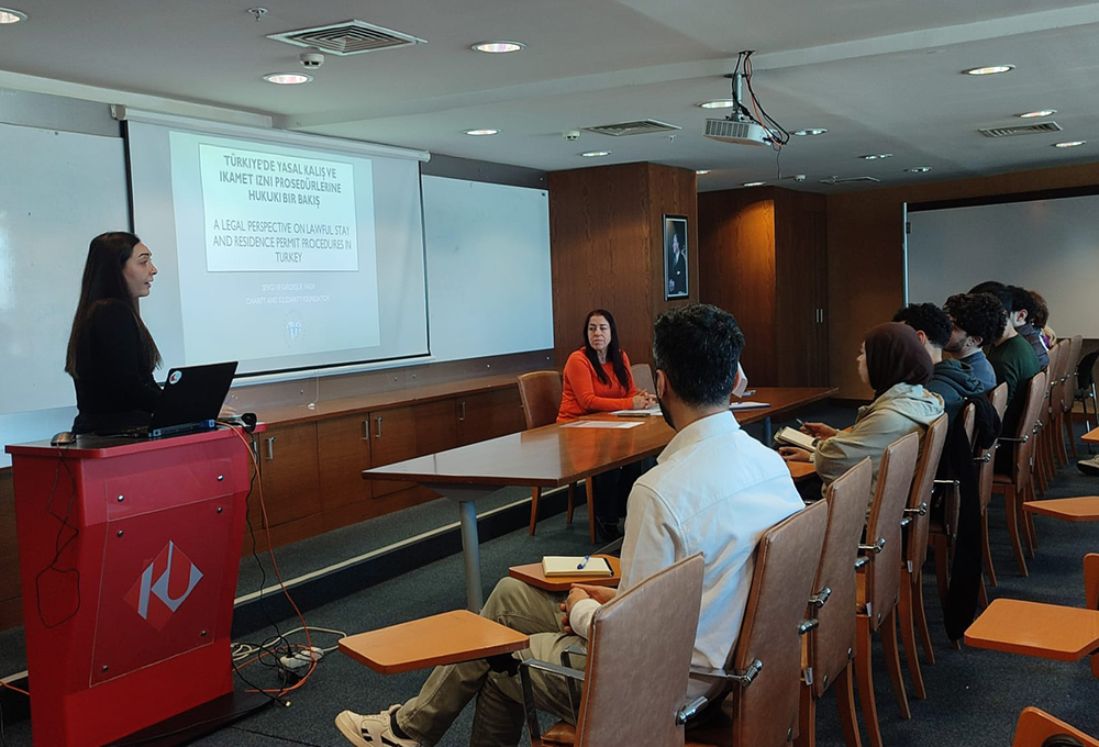 Etkinliğe konuşmacı olarak katılan Dr. Av. Cansu Pişkinpaşa Köklü, Türkiye’de yasal kalış ve ikamet izni süreçlerine ilişkin hukuki çerçeveyi öğrencilerle paylaştı. Türkçe, Arapça ve İngilizce olarak gerçekleştirilen etkinlikte öğrenciler, konuya dair merak ettikleri soruları yöneltme ve farklı ülkelerden katılımcılarla bir araya gelme fırsatı buldu.